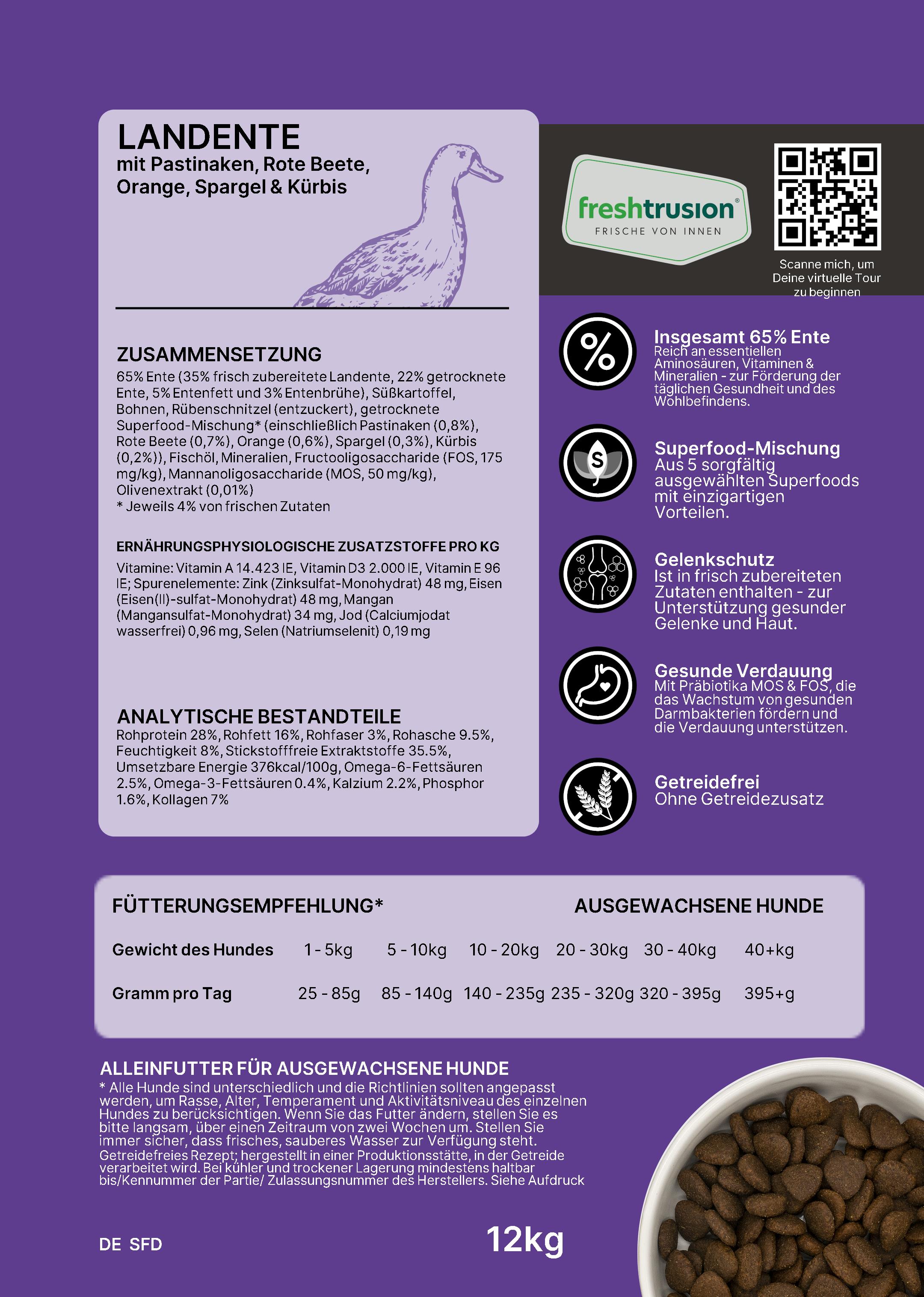65% Ente (35% frisch zubereitete Landente, 22% getrocknete Ente, 5% Entenfett und 3% Entenbrühe), Süßkartoffel, Bohnen, Rübenschnitzel (entzuckert), getrocknete Superfood-Mischung* (einschließlich Pastinaken (0,8%), Rote Beete(0,7%), Orange (0,6%), Spargel (0,3%), Kürbis (0,2%)), Fischöl, Mineralien, Fructooligosaccharide (FOS, 175 mg/kg), Mannanoligosaccharide (MOS, 50 mg/kg), Olivenextrakt (0,01%)