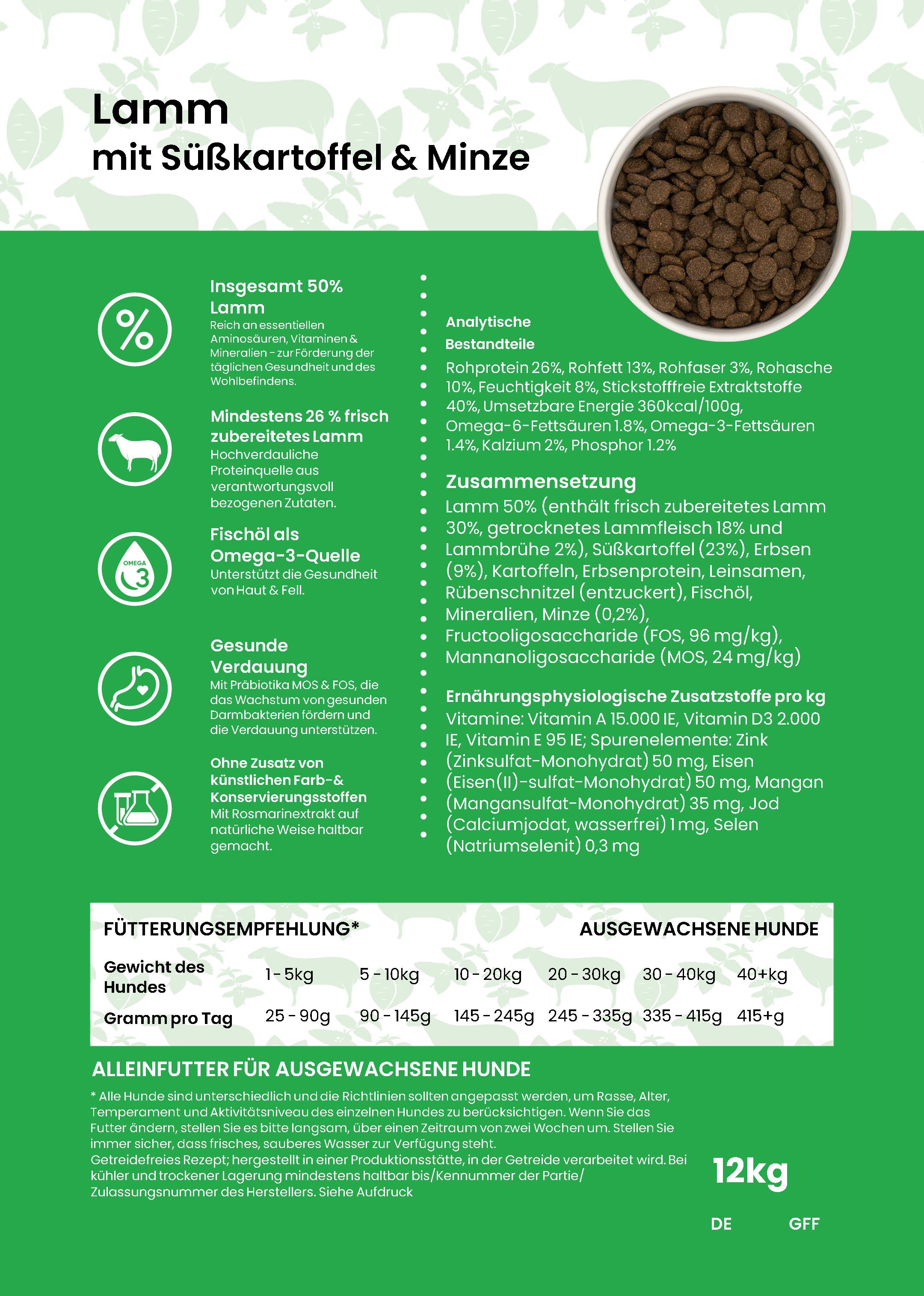 Lamm 50% (enthält frisch zubereitetes Lamm 30%, getrocknetes Lammfleisch 18% und Lammbrühe 2%), Süßkartoffel (23%), Erbsen (9%), Kartoffeln, Erbsenprotein, Leinsamen, Rübenschnitzel (entzuckert), Fischöl, Mineralien, Minze (0,2 %), Fructooligosaccharide (FOS, 96 mg/kg), Mannanoligosaccharide (MOS, 24 mg/kg)