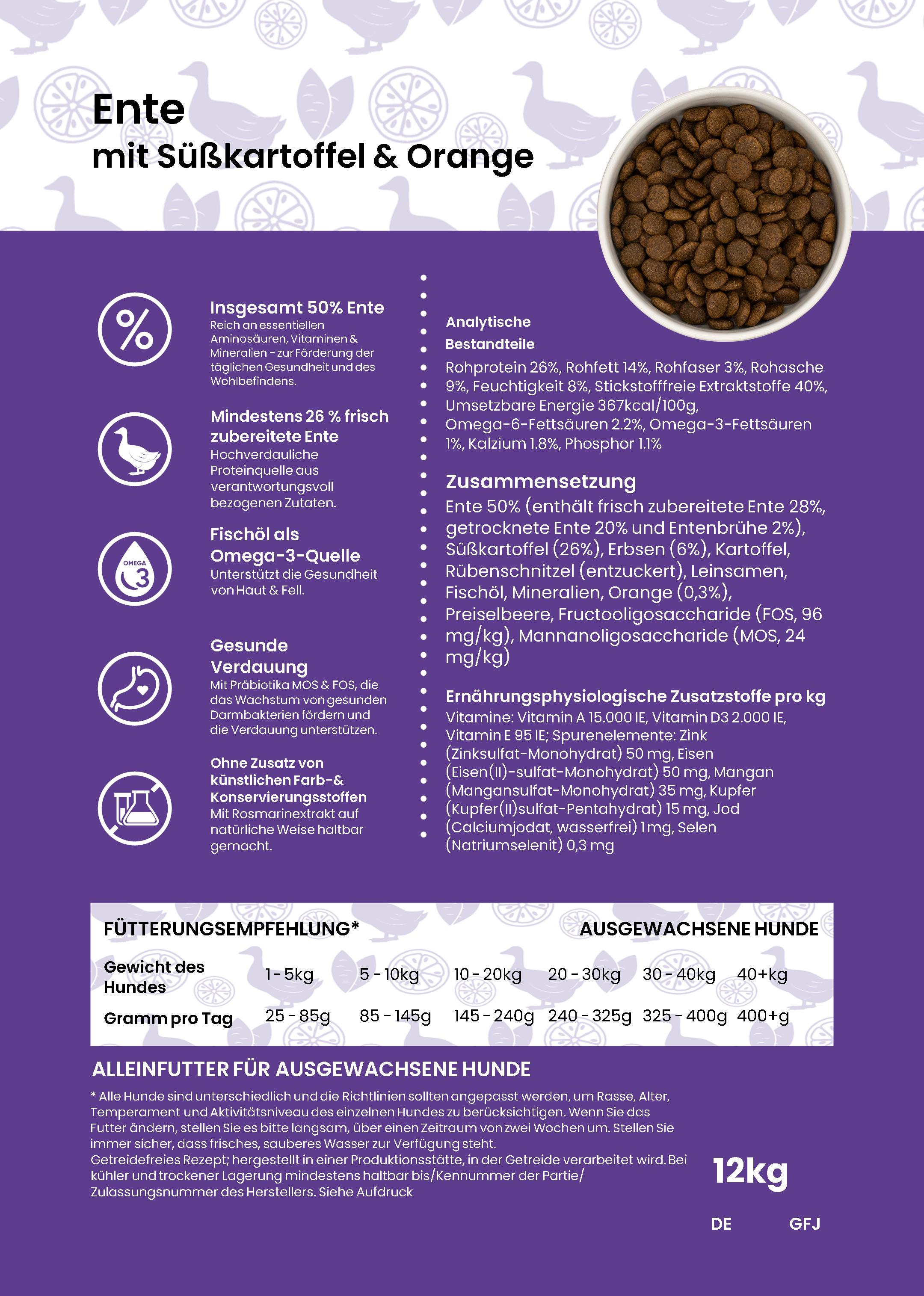 Ente 50% (enthält frisch zubereitete Ente 28%, getrocknete Ente 20% und Entenbrühe 2%), Süßkartoffel (26%), Erbsen (6%), Kartoffel, Rübenschnitzel (entzuckert), Leinsamen, Fischöl, Mineralien, Orange (0,3%), Preiselbeere, Fructooligosaccharide (FOS, 96 mg/kg), Mannanoligosaccharide (MOS, 24 mg/kg)