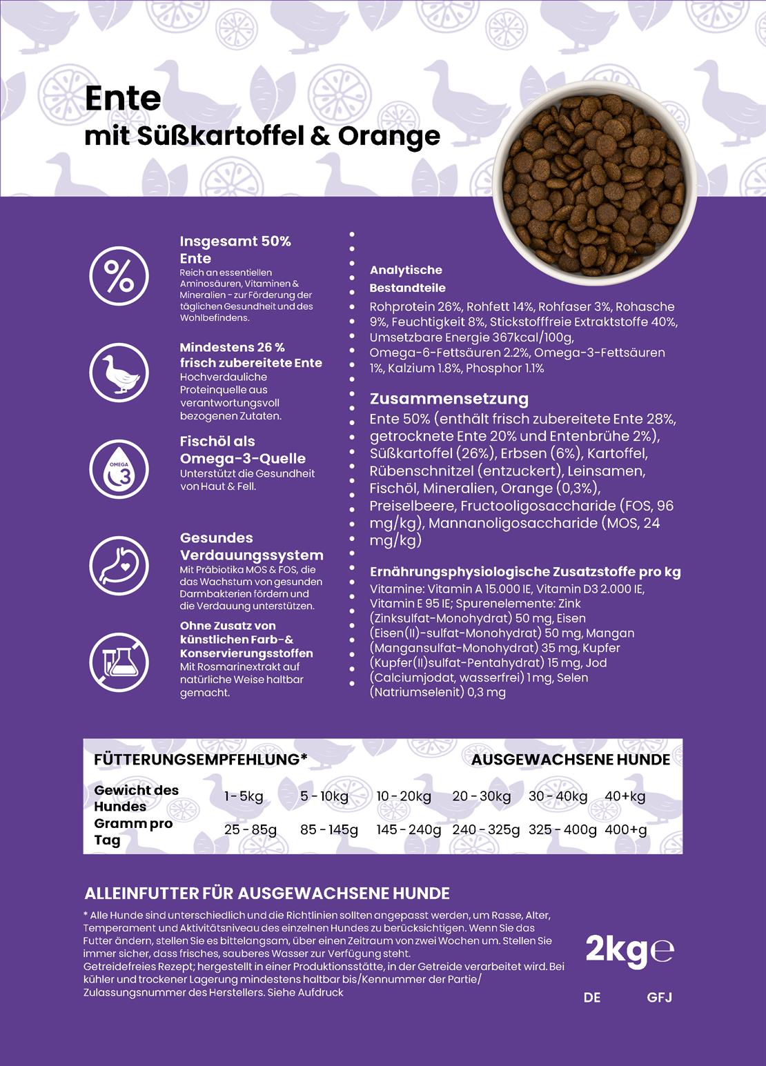 Ente 50% (enthält frisch zubereitete Ente 28%, getrocknete Ente 20% und Entenbrühe 2%), Süßkartoffel (26%), Erbsen (6%), Kartoffel, Rübenschnitzel (entzuckert), Leinsamen, Fischöl, Mineralien, Orange (0,3%), Preiselbeere, Fructooligosaccharide (FOS, 96 mg/kg), Mannanoligosaccharide (MOS, 24 mg/kg)