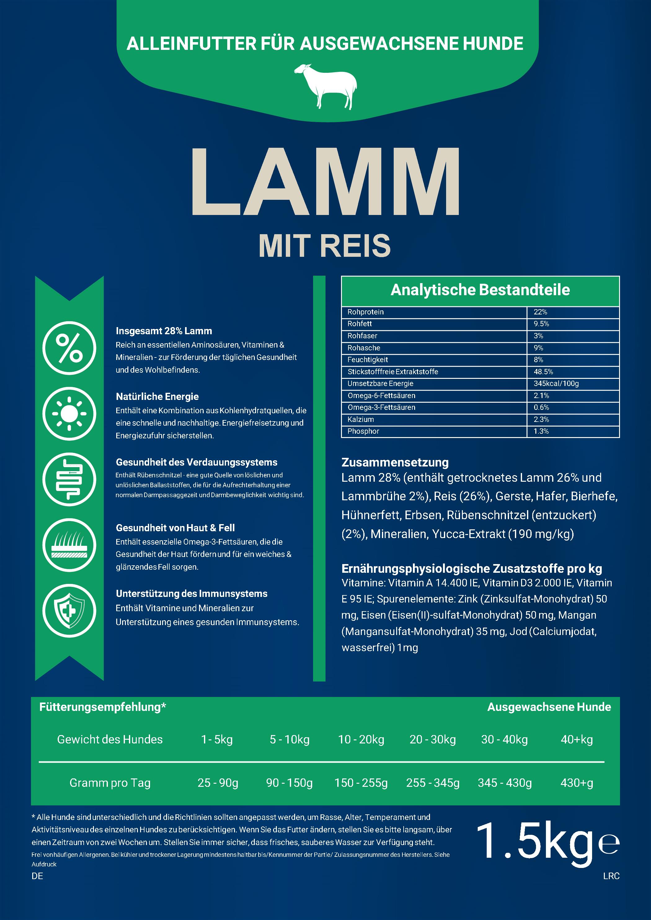 Lamm 28% (enthält getrocknetes Lamm 26% und Lammbrühe 2%), Reis (26%), Gerste, Hafer, Bier- hefe, Hühnerfett, Erbsen, Rübenschnitzel (entzuckert) (2%), Mineralien, Yucca-Extrakt (190 mg/kg)