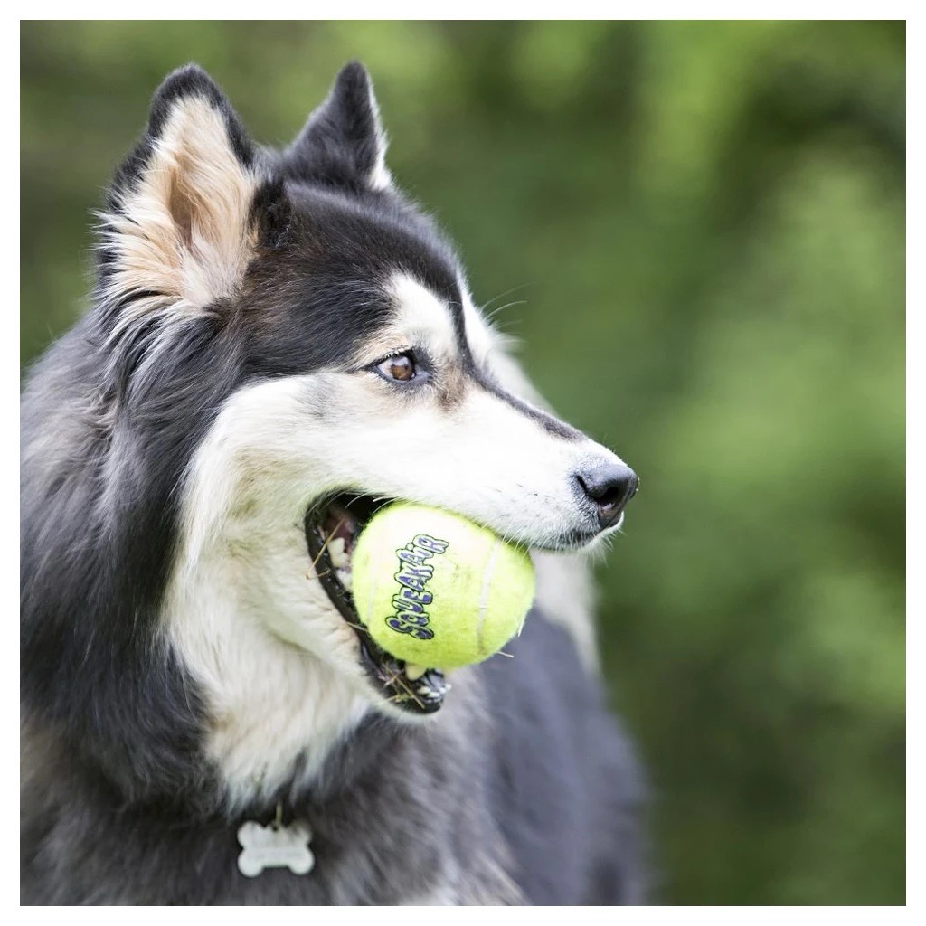 Die Kombination aus zwei klassischen Hundespielzeugen – Tennisball und Quietscher – macht diesen Ball zum perfekten Apportierspielzeug. Der robuste und hochwertige Squeakair Ball schont die Zähne Ihres Hundes. Er besteht aus speziellem, zahnschonendem Filz, im Gegensatz zu herkömmlichen Tennisbällen, deren Material oft scheuert.